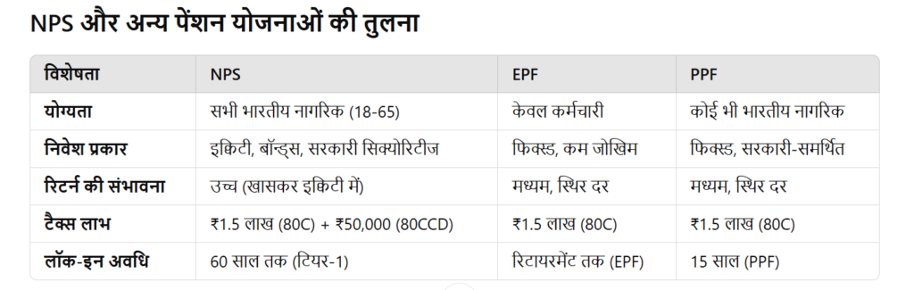 - कम प्रबंधन शुल्क: NPS के प्रबंधन शुल्क अन्य पेंशन योजनाओं की तुलना में बहुत कम होते हैं।