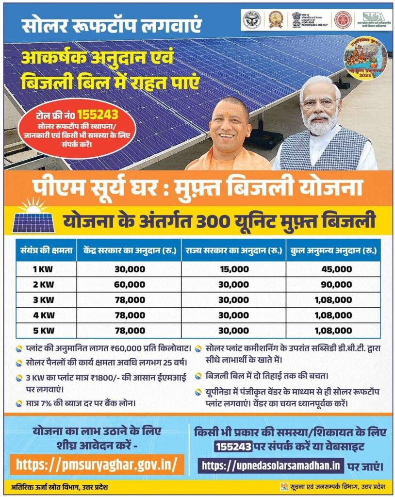 - सब्सिडी: सौर पैनल लगाने पर ₹108,000 तक की सब्सिडी, सीधे लाभार्थी के बैंक खाते में जमा की जाएगी।